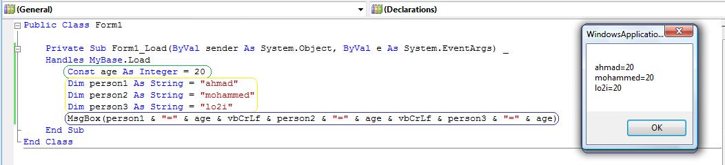 Dim name As String = "mr.mohammed", age As Integer = 12, marry As Boolean = True