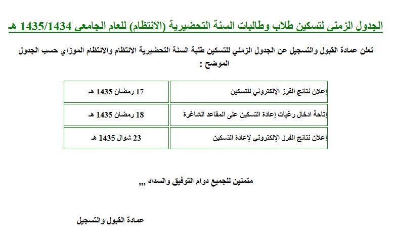 الجدول الزمني لتسكين طلاب وطالبات السنة التحضيرية