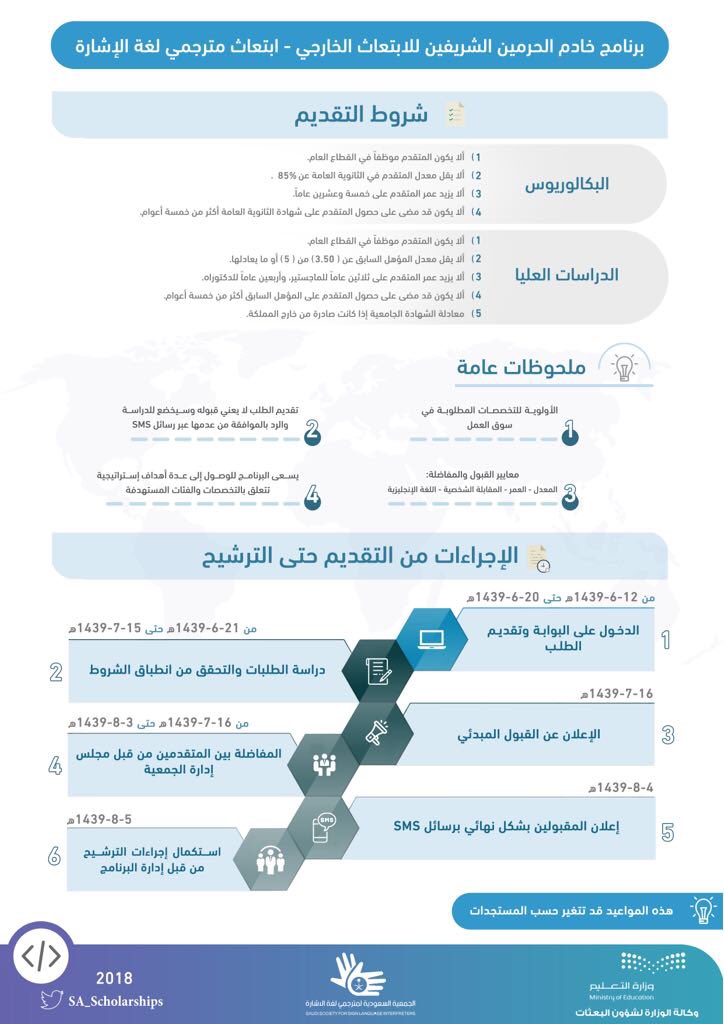تعلن وزارة التعليم وبالتعاون مع جمعية السعودية لمترجمي لغة الإشارة عن فتح القبول للابتعاث الخارجي في تخصص مترجم لغة الإشارة لجميع التخصصات المطلوبة لسوق العمل بداية من الأسبوع القادم يوم