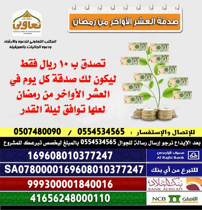 ملاحظة مهمة جداً / بعد الإيداع نرجو إرسال رسالة للجوال 0554534565 ويوضح فيها المبلغ ونوع المشروع (صدقة العشر الأواخر من رمضان) ليخصص تبرعك للمشروع