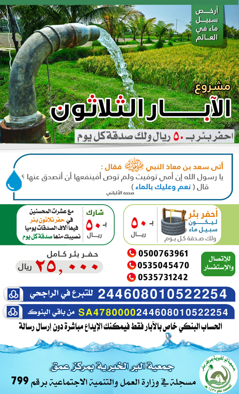 مشروع الآبار الثلاثون برعاية جمعية البر الخيرية بمركز عمق وهي جمعية رسمية مسجلة في وزارة العمل والتنمية الاجتماعية برقم 799