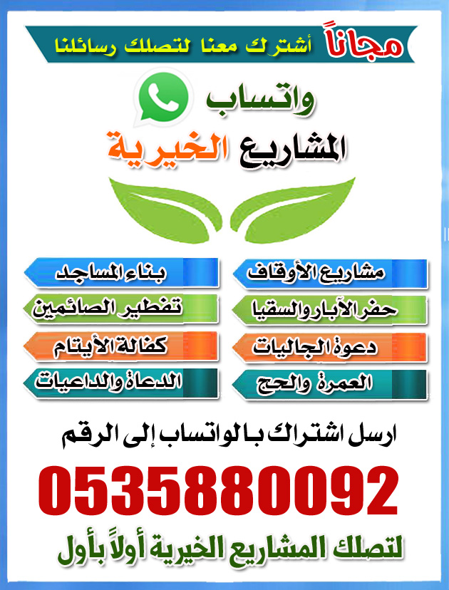 فقط أحفظ أسمهم في جوالك بأسم (واتس المشاريع الخيرية) ثم ارسل اشتراك بالواتساب الى رقمهم 0535880092 بعدها ستصلك رسائلهم ومشاريعهم اليومية